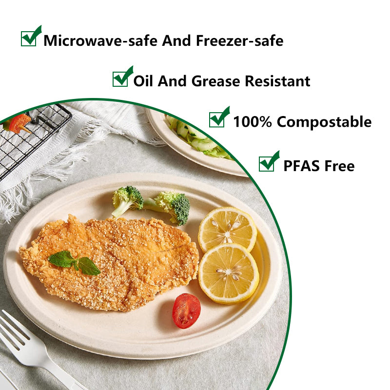 These eco-friendly, compostable plates are made from surplus sugarcane (bagasse) and wheat straw agricultural fiber. These natural materials are fully renewable, compostable and sustainable. They are perfect for handling both hot and cold items.